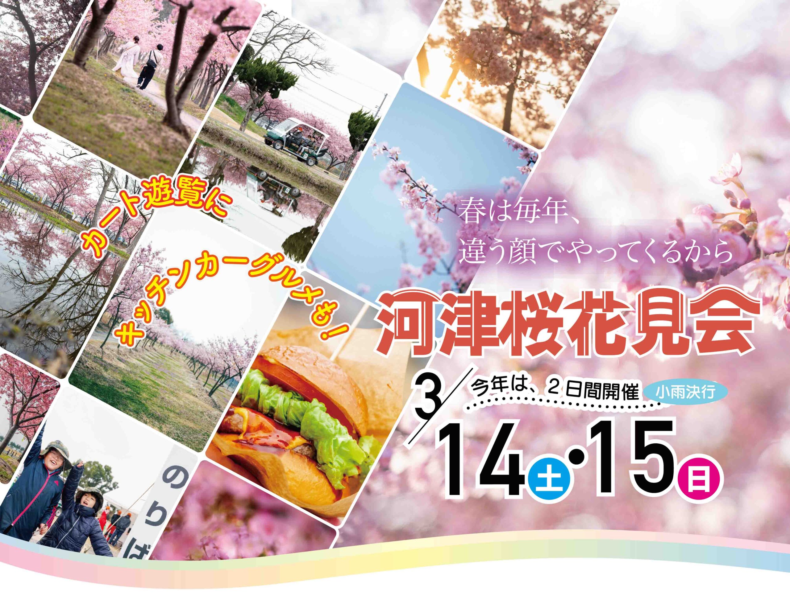 春は毎年、違う顔でやってくるから。今年の春にも会いにいこう!今年は2日間開催です。2026年3月14日(土)・3月15日(日)児島湖花回廊お祭りひろばにて。午前9時から午後4時まで開催カート遊覧やキッチンカーグルメもお楽しみください。